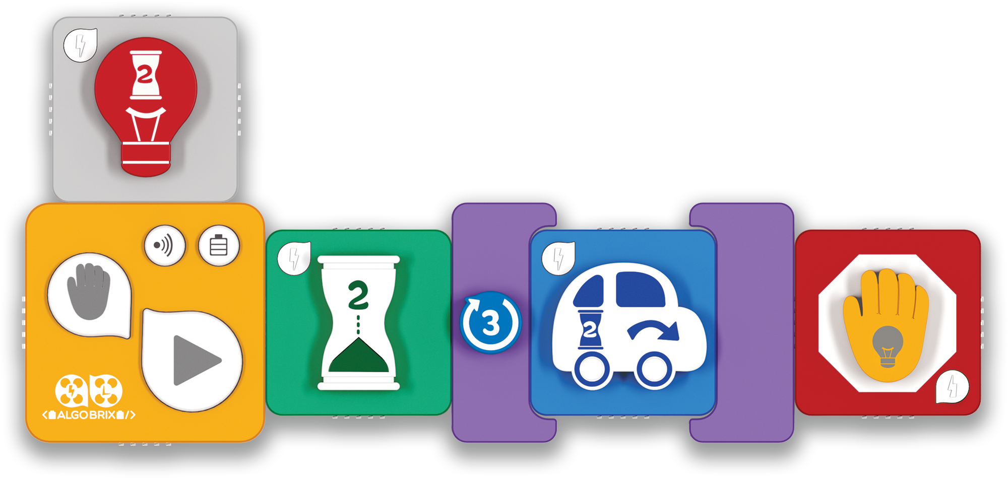 With the tangible coding language of Algobrix®, students begin by constructing a building block model, then create various code sequences using Function & Parameter blocks. Finally, by pressing the Play block, the robot will perform the coding sequence.