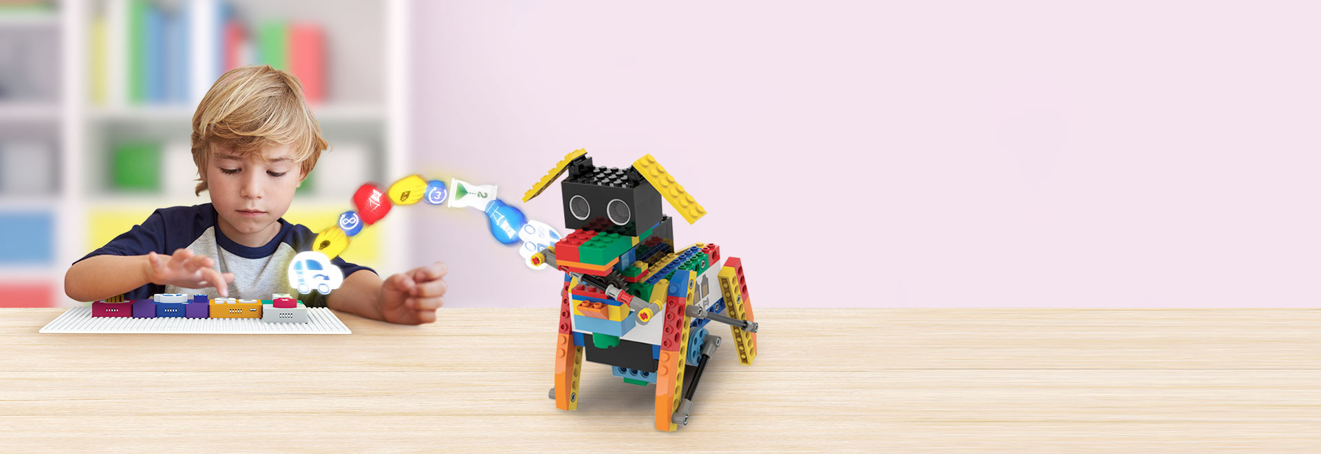 By matching function and parameter blocks together, the child creates a set of commands for the robot to perform. For example, moving it forward or turning on a red light.
